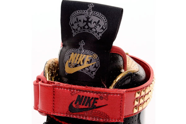 About 3 years ago Nike released a Mighty Crown Pack. It was a pair of Dunk high’s and Nike Court Force Low. Today the group announced that they are working with Nike Sportswear on another shoe. First introduced as a basketball shoe in 1981, the Nike Dynasty High is making a return next year as part of the Spring 2010 collection. But before the general release, we may see them before the year end. The Mighty Crown edition is specially made up for the 15th Anniversary of Mighty Crown Yokohama Reggae Festival. The shoe features a black premium leather upper with red and gold accents. Python textured leather is used around the toe cap and crown pattern is featured on the side panel. Similar to the Nike Sportswear Rock Pack, the shoe also comes with studded strap. Look along the strap I’m sure you will be attracted by the metallic gold lining. In addition, the tongue is done with a ultra long tag with double crown images on it. Move to the bottom part of the shoe you may spot the cracked prints mid-sole.