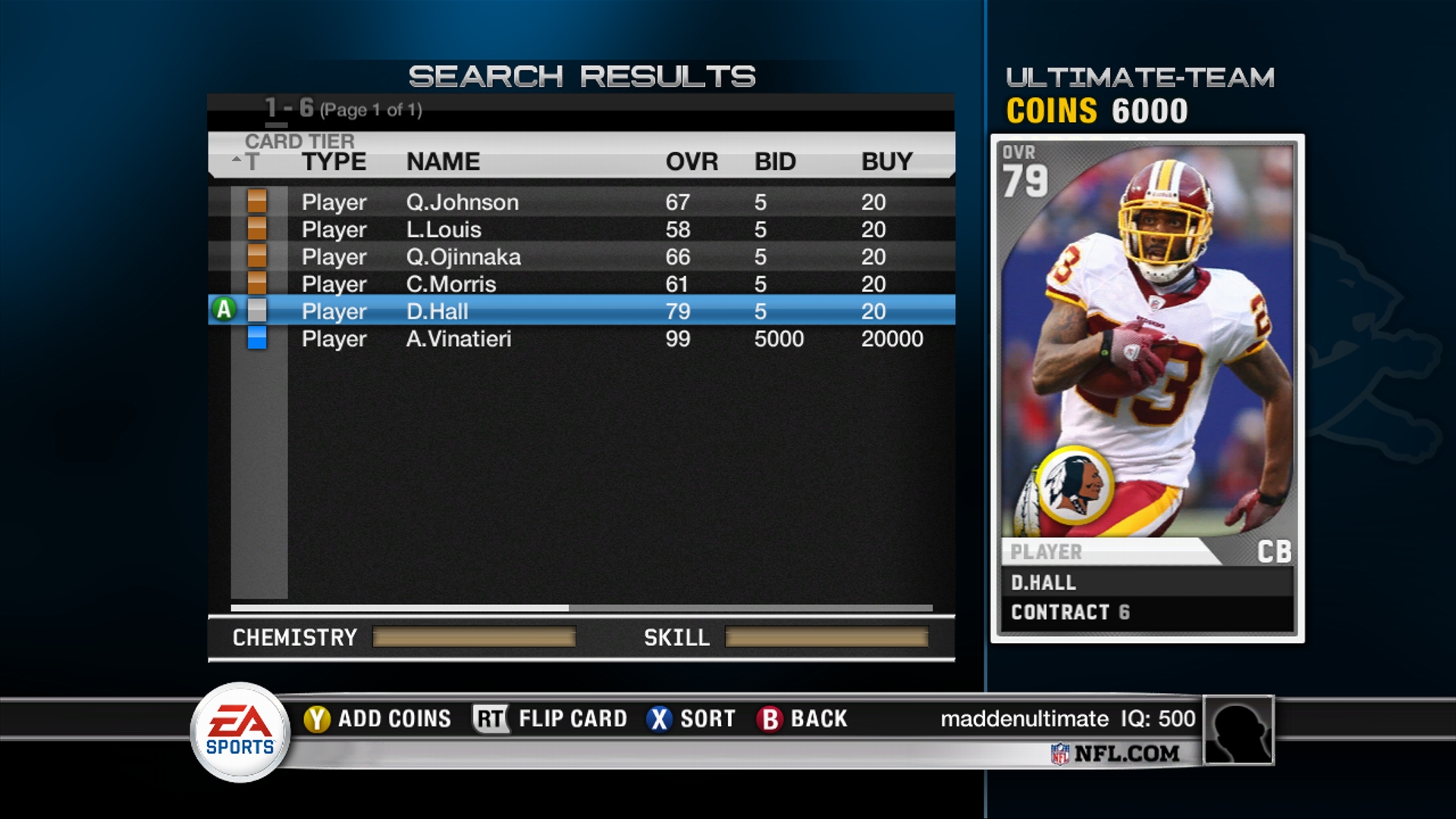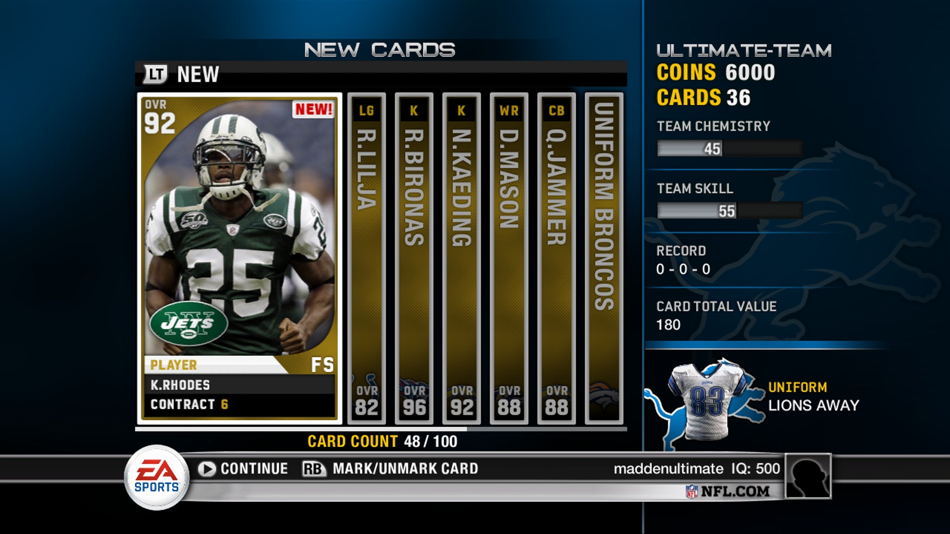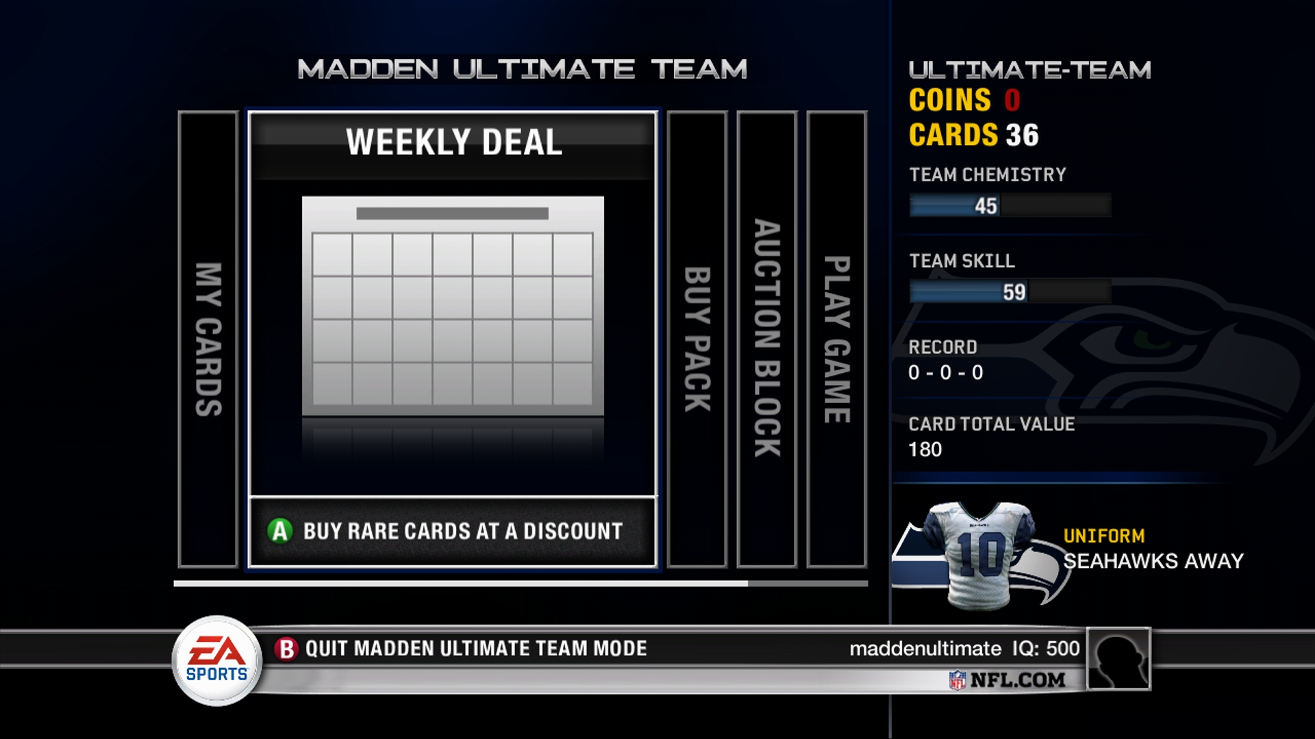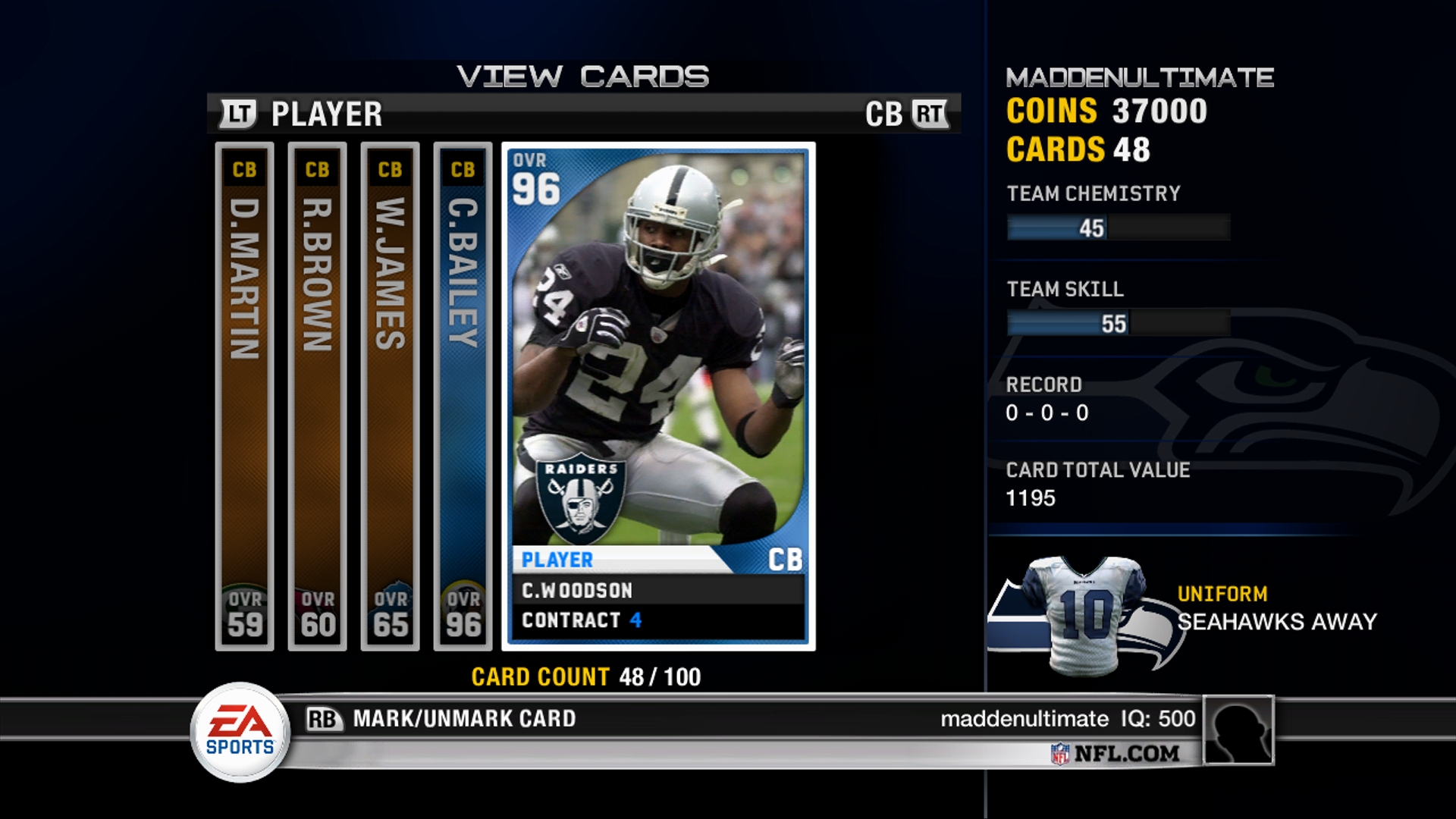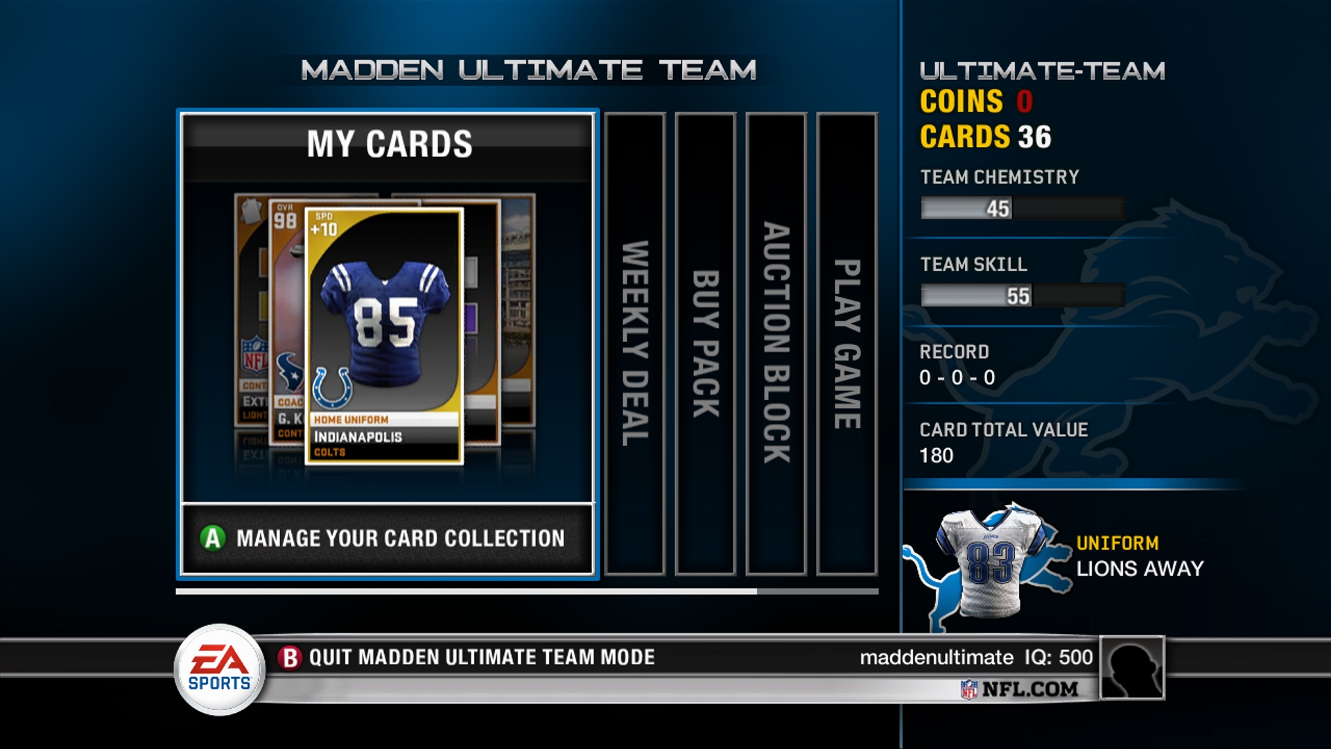 Madden Ultimate Team allows fans to collect up to nine types of cards through, platinum, gold, silver and bronze virtual packs. The customization options are endless as you are responsible for selecting everything from the team playbook to the uniforms. Earn coins to buy new cards or card packs through your performance on the field, acquire new cards through the auction block, or purchase card packs through the in-game store. Collect cards with players from the same pro and college team to get an on-field chemistry boost. Collect rare, legendary player cards to put your team over the top, like the 1999 Vikings Randy Moss and the 1995 Packers Brett Favre player cards. You can even back up Brett with his 2009 Vikings player card. Build a dynasty through weekly online deals or find the final missing piece to your team’s puzzle.