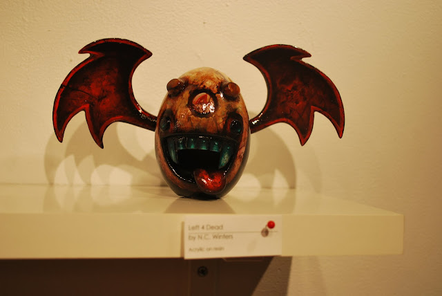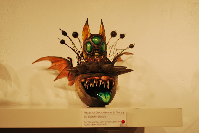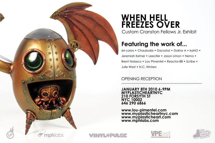 I ventured out to the city after work to MPH (myplasticheart) for the When Hell Freezes Over art show. Got to meet a lot of cool artists for the first time, even though I talk to them occasionally on twitter. It was a good to put a face to the screenname. Got to meet kanO, sketchbot, tenacious toys, and Lou. Who was awesome, and I did a sketch. Also bought a piece, my first of probably many customs (I got the kanO one!). It was a good time and lots of fun!