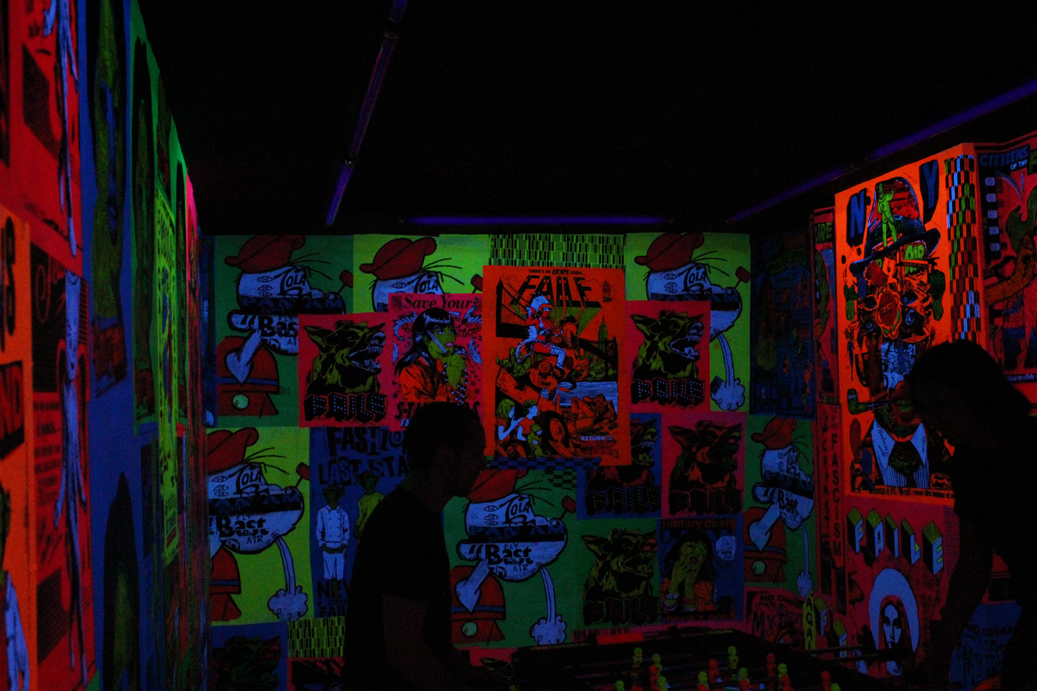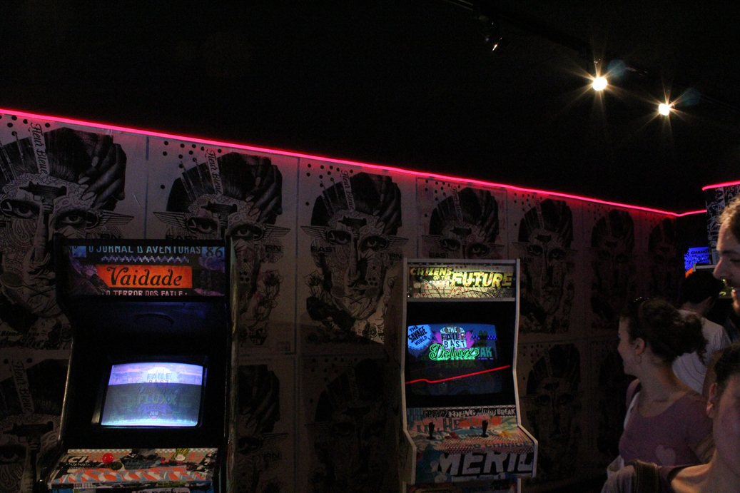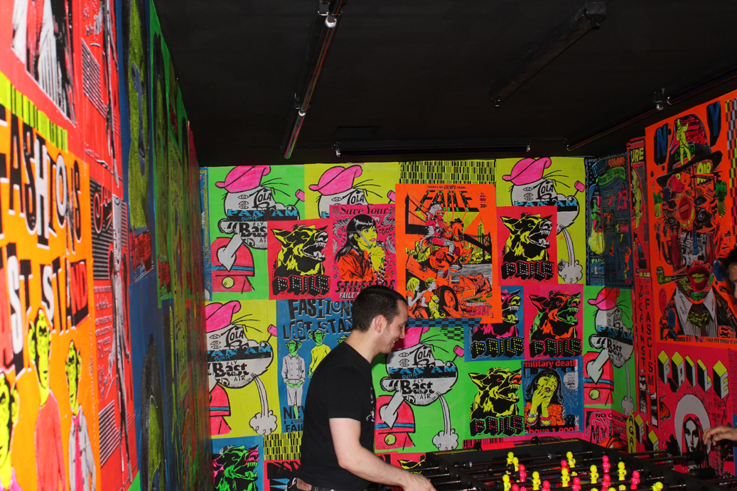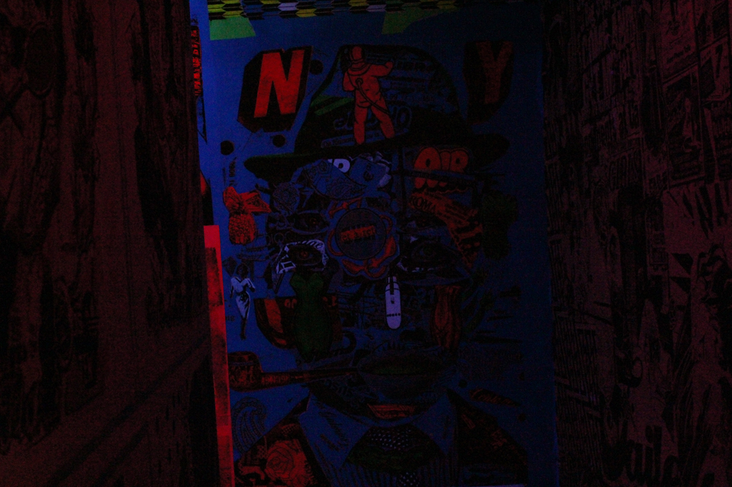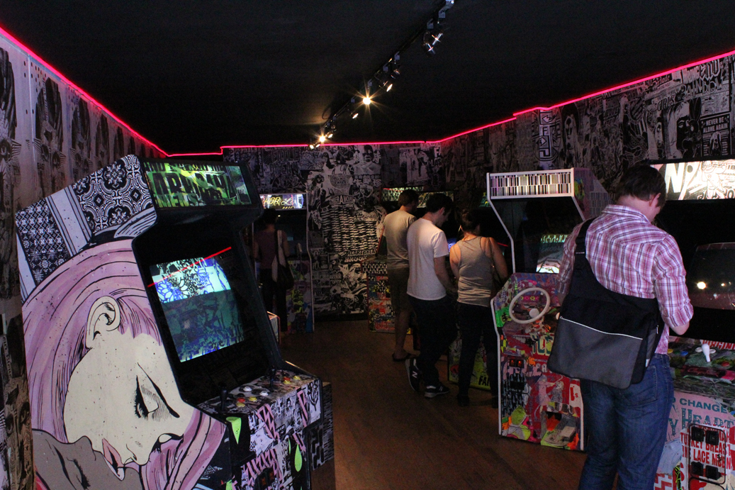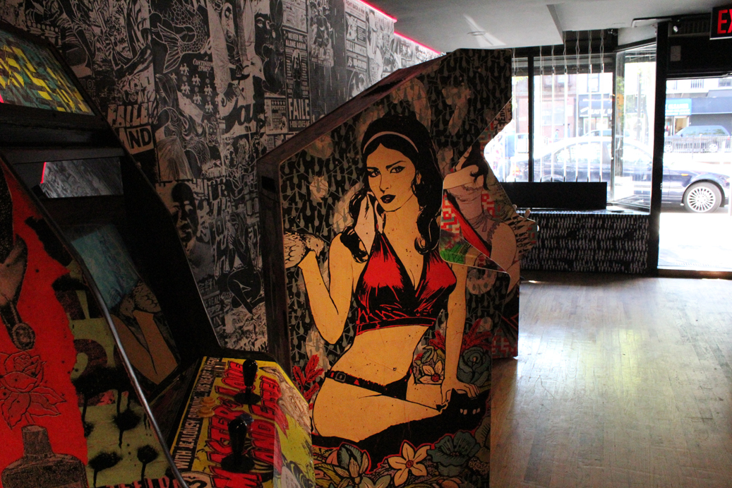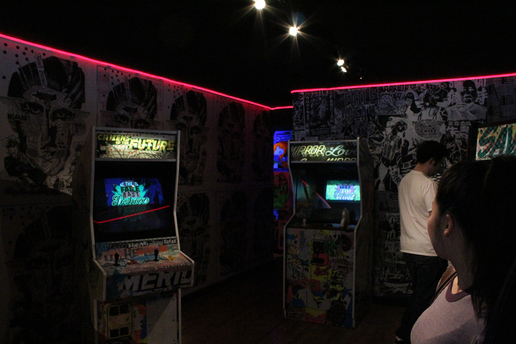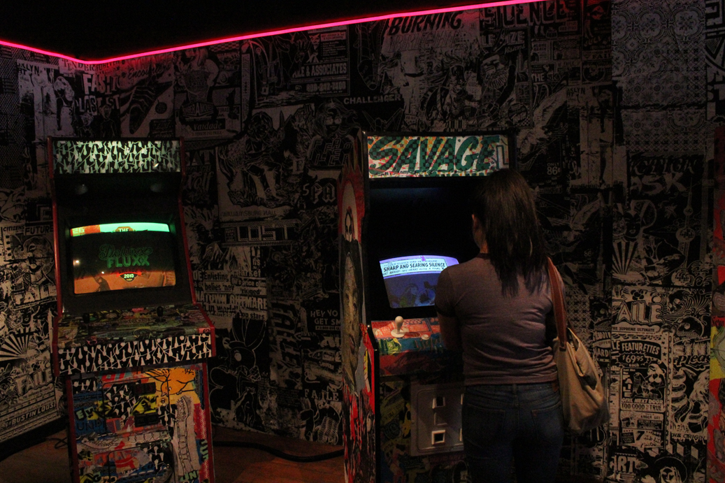 So, I finally had time to check out the Faile & Bast Deluxx Fluxx Arcade (158 Allen St. NY, NY aka Reed Space Annex), oh boy was I amazed. So we stepped in and was looking to actually pay to play but in reality it was totally free! If you were to buy some tokens you’d get a special clip of some sort, I just bought the token as a souvenir. There’s about seven or so setups and a Foosball table in the far back in another room. I’m sure the entire place looks wicked at night since the walls are lined with black, white, and neon artwork along with black lights. There was absolutely no point to any of the games – they are interactive art. I only took one video (see below) because they are basically all the same. There are no instructions to any of the games; Player 1 & 2 Start buttons, arcade stick, and 2-4 buttons – move the art around and press a button to perform an action. Let the pictures explain for themselves.