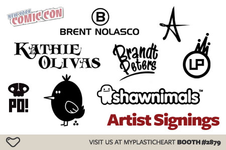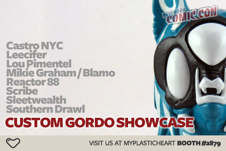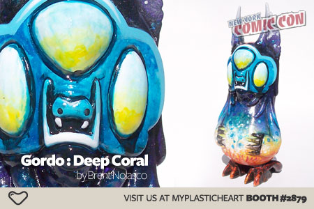 In addition to our Deep Coral Gordo release we’ll also be showcasing custom Gordos designed by some amazing artists. The Custom Gordo Showcase features one of a kind hand painted and sculpted interpretations of the Gordo figure by Brent Nolasco. On display will be amazing work from the likes of Scribe, Reactor88, Lou Pimentel and more… Check out the showcase at the NYCC myplasticheart booth #2879 from 10/8 – 10/10.