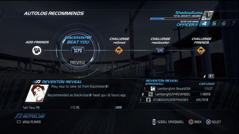 The new feature to the racing world is the Autolog which I briefly mention. Think about it as your racing social network where it informs you of your friends that conquered races on the map and it is up to you to beat their score. This is the competition that many ask for, but I felt that at least this feature could of been cross platform when you think about. If you can send your ghost race to another person on either the other consoles or even send messages through the NFS Autolog feature that can be shared through all the consoles. The news feed gives you the latest updates on all things related to need for speed as well as new DLC for you to purchase. The cool part is Criterion games helped with the development of the game, so all those features are similar to the news feed you see in burnout which worked great.
