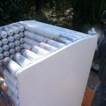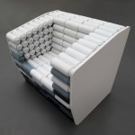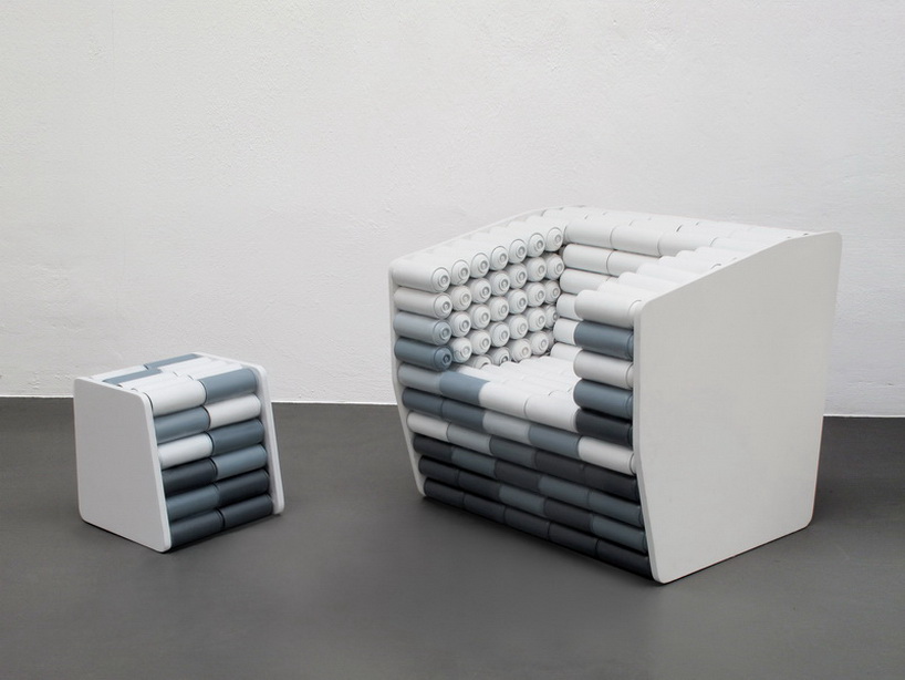 This looks like something out of the world of Tron or some future world that is minimalist in design. It’s also a cleaver way of up-cycling empty spray cans  that can’t be recycled and usually just sit in a landfill. Throw a nice cushion from IKEA on there and I can see this in my home. I wonder if it rattles when you shake the chair? Check out more images of the chair below.
