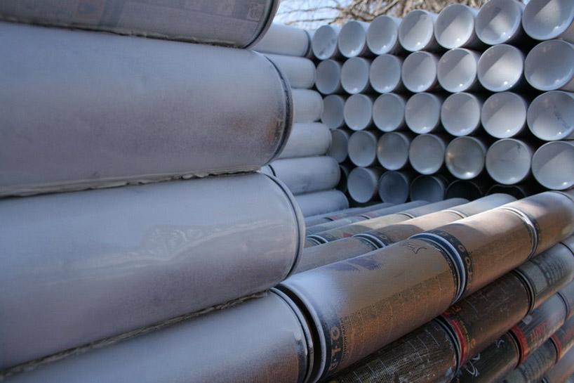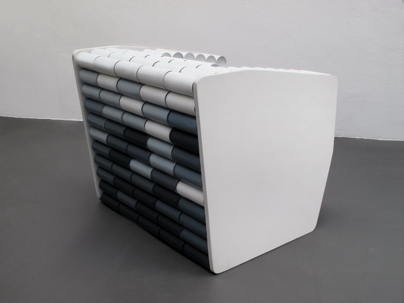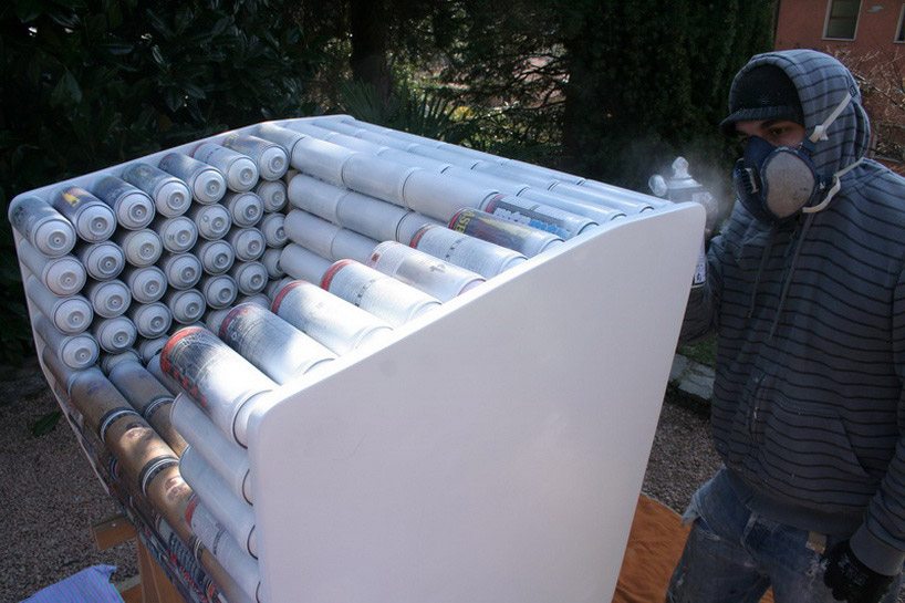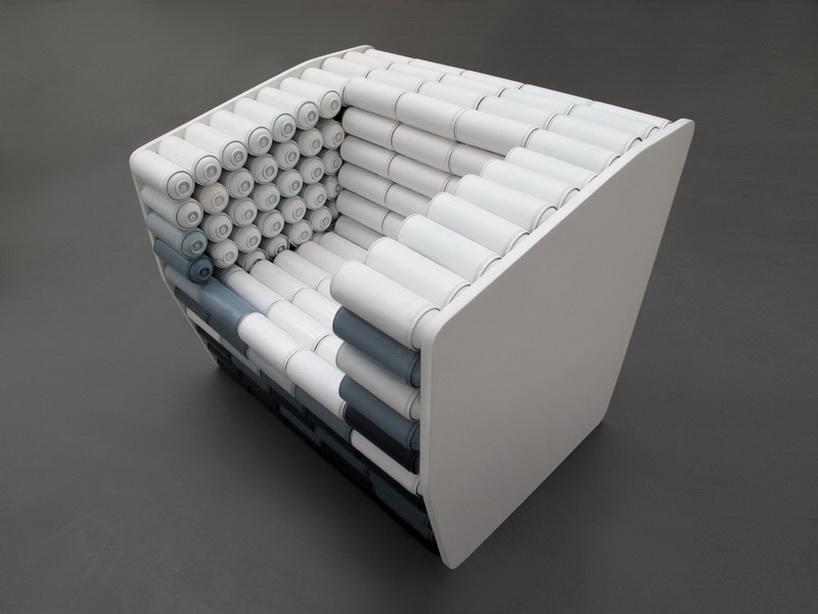 This looks like something out of the world of Tron or some future world that is minimalist in design. It’s also a cleaver way of up-cycling empty spray cans  that can’t be recycled and usually just sit in a landfill. Throw a nice cushion from IKEA on there and I can see this in my home. I wonder if it rattles when you shake the chair? Check out more images of the chair below.