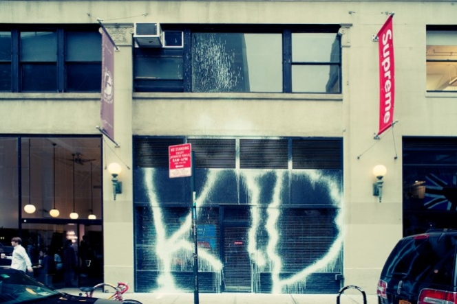 Last night Supreme got the I’m-an-angry-hypebeast treatment. According to some sources it may be the French artist, Kidult. A few more photos after the jump