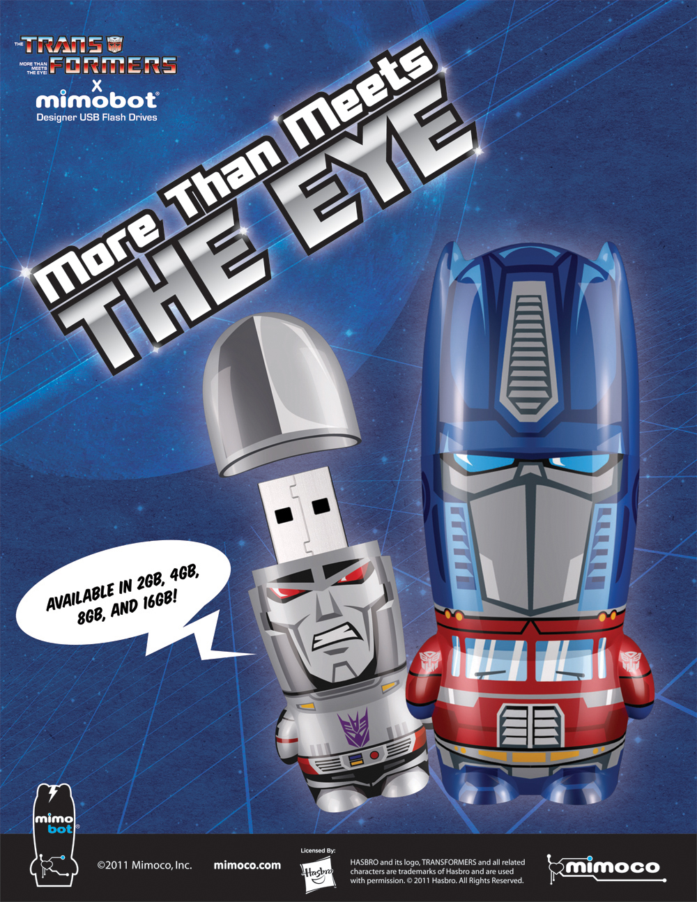 Mimobot is doing it up with these awesome Transformers USB thumb drives. The drives are sporting the classic images of Optimus Prime and Megatron and they come pre-loaded with desktop wallpapers, digital comics, videos, icons, avatars and screensavers. The sizes range from 2GB up to 16GB and should be hitting retail stores very soon or you can head on over to the Mimobot site and order one today.