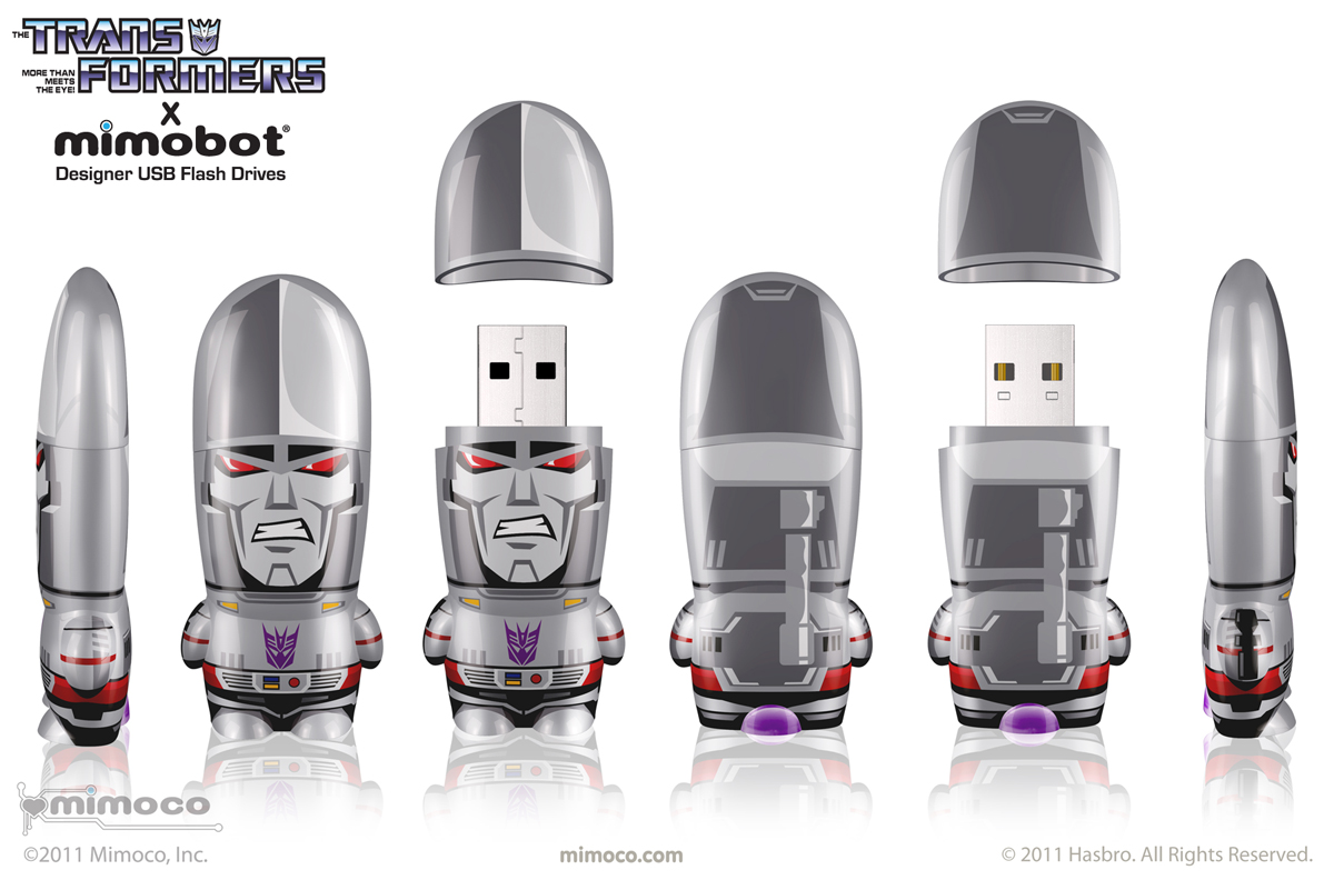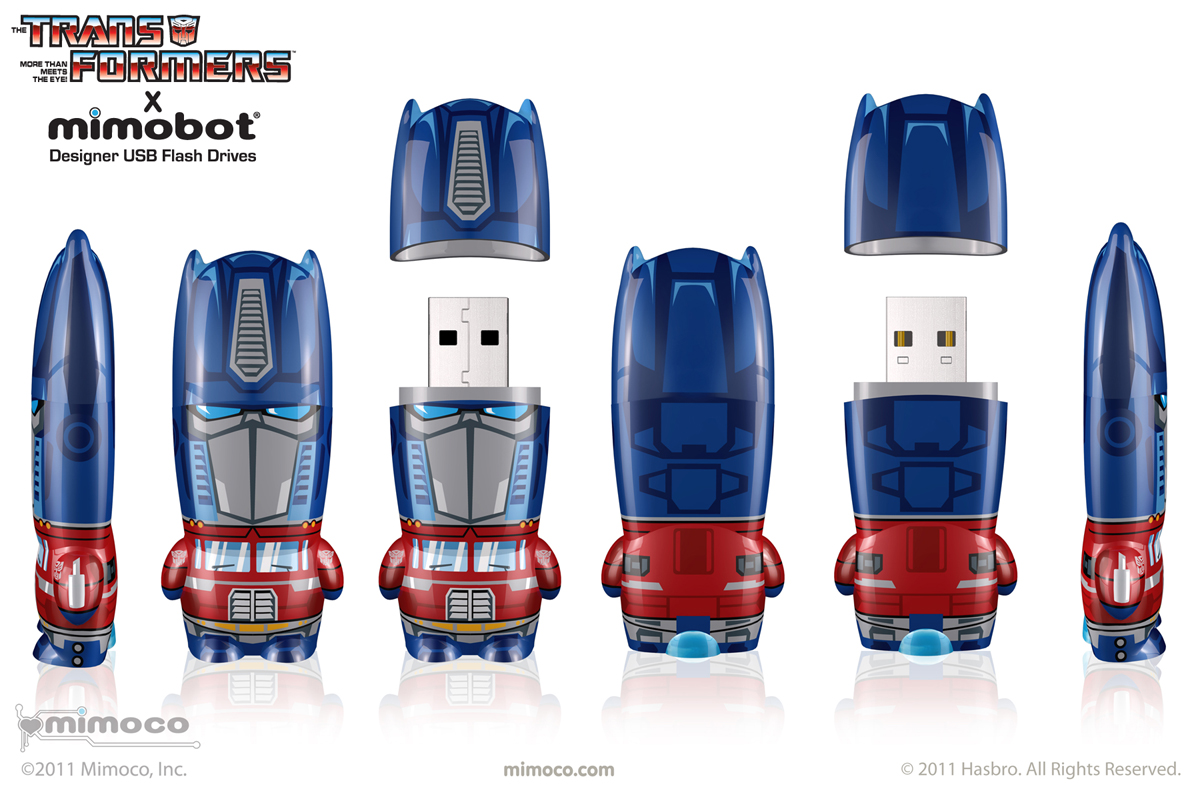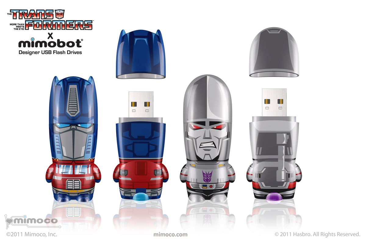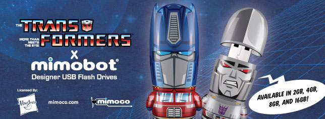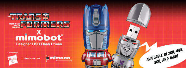 Mimobot is doing it up with these awesome Transformers USB thumb drives. The drives are sporting the classic images of Optimus Prime and Megatron and they come pre-loaded with desktop wallpapers, digital comics, videos, icons, avatars and screensavers. The sizes range from 2GB up to 16GB and should be hitting retail stores very soon or you can head on over to the Mimobot site and order one today.
