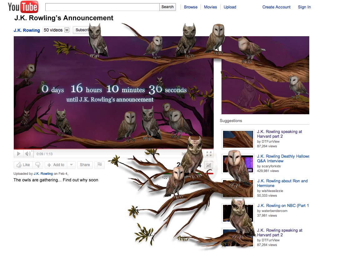 So I’m a huge Harry Potter fan, I will admit that I was not at first but I got drawn into when I became pregnant and decided to read the entire series. Apparently, JK Rowling has announced a new site, Pottermore. No one knows what it is. There are a bunch of different rumors, some say its a gaming thing, some say its another book (that’s what I hope for), others say its social network for Potter fans. I hope its another Potter book, although Rowling had said that she didn’t want to write anymore about Potter, I hope she changed her mind. I would love to know more about the rest of Potter’s life. But no one really knows what Pottermore is or will be. But there is a way to watch the ticker, since there isn’t one on the actual site. There is a youtube with it though and since the last time I checked it there are more owls that have appeared! I honestly can’t wait…