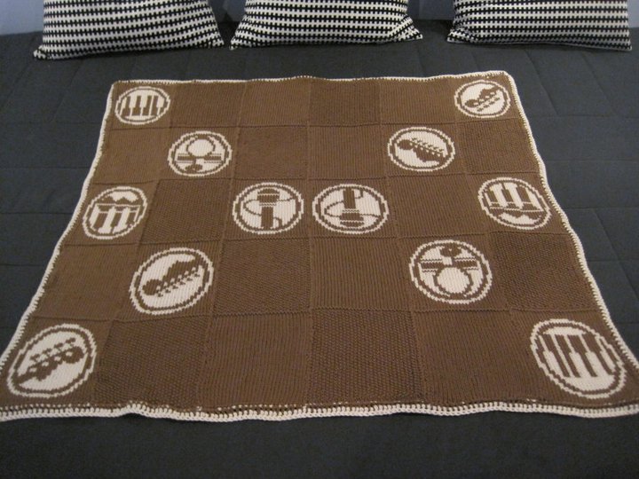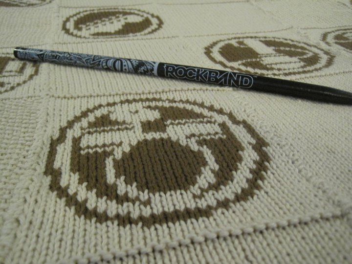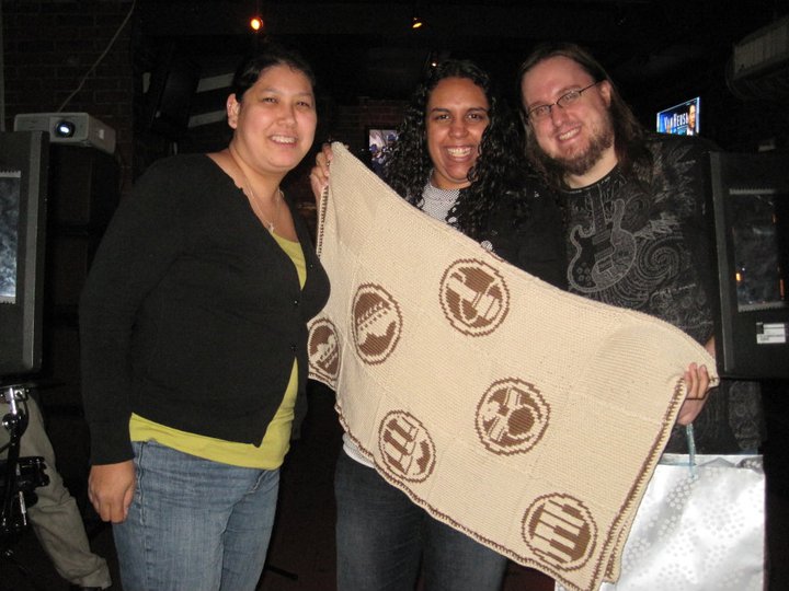 So a friend of mine, Izzy, she is expecting a baby, her and her boyfriend (Chris) are avid RockBand Gamers. They both also works as at RockGamer Studio, an authorizing studio for RockBand. Izzy got surprised by another friend of mine, Karen (pictured in black sweater & yellow shirt), who is the most awesome knitter I know. Karen knitted the expecting couple a RockBand blanket with all the RockBand icons. Needless to say Karen’s work is impressive and awesome. Kudos to Karen and congrats again to Izzy and Chris. Want to check out more about Karen here.
