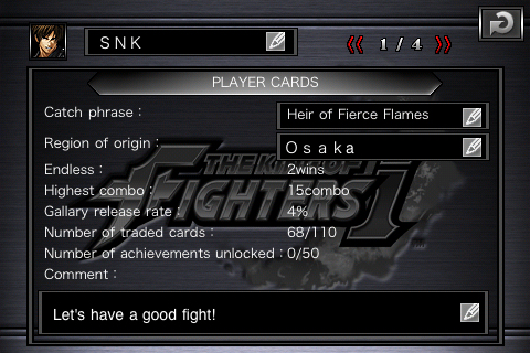 Various bonus content can be unlocked during gameplay and viewed within the game’s “Gallery” mode. Here players will find premium trading cards based on original SNK PLAYMORE illustrations, various art and rough sketches of KOF characters, KOF Team novel stories from the upcoming THE KING OF FIGHTERS XIII and many more hidden treasures that fans can’t afford to miss! Bonus content can also be traded at any time via the in-game marketplace.
