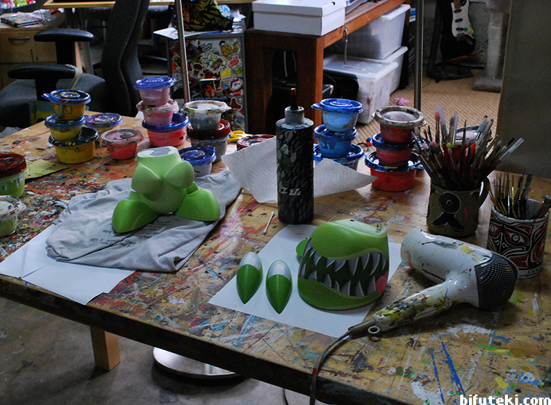 There will be 40 unique figures and will be released periodically – four of the five are already sold out (August 20th) for a cool $1500 a piece. I feel the price is just, because of the time and effort put into each figure – each piece is created, designed, and hand-painted by Joe Ledbetter. Check the pics below as we caught him working on the first few Mutant Bunnies.