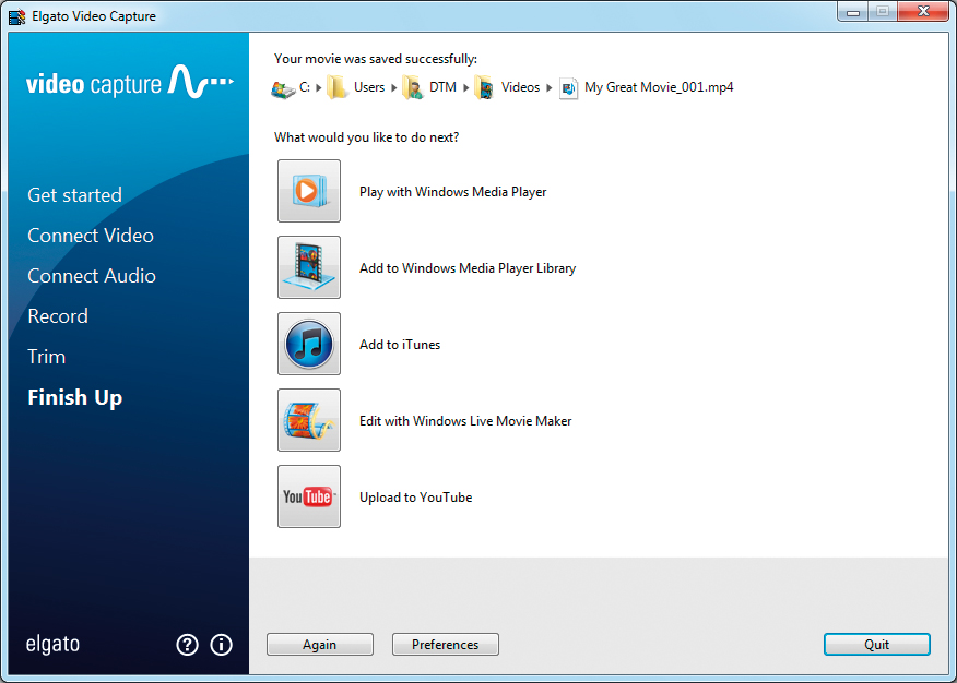 The Elgato Video Capture software for Windows 7 provides users with a supremely easy way to digitize video. Elgato Video Capture software guides you through every step, from connecting an analogue video source to capturing video as a high quality H.264 file. With just one click, you can add your video to iTunes or to your Windows Media Player library; you can play back the video on your computer or sync it with your iPad or iPhone; you can upload your video directly to YouTube; and you can edit it right away in Windows Live Movie Maker.