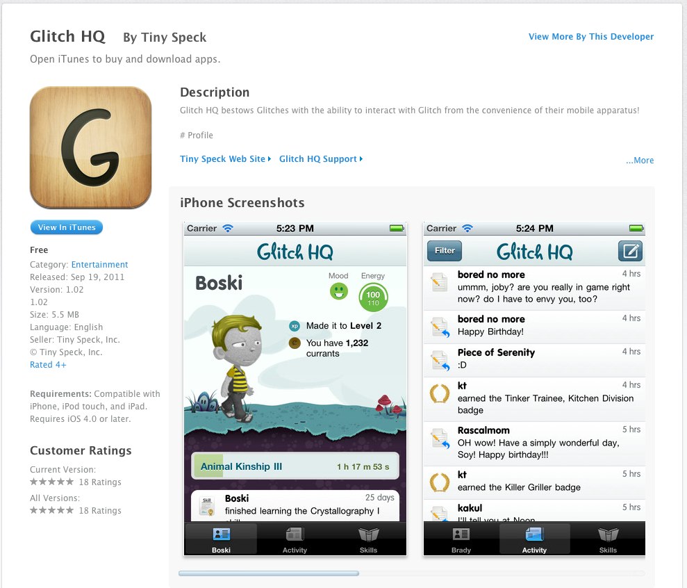 Yes, now my obession with Glitch is on the go! You can now download their iTunes App, that allows you to post, and reply to updates, accept contact requests, learn and switch skills, and visit player profile pages to admire avatars in all their splendor.