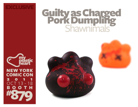 Squibbles Ink, Shawnimals and myplasticheart have collaborated on these two editions of Halloween-inspired, hand-painted dumplings made especially for NYCC 2011. Shawnimals (booth 581) will feature the pumpkin-orange, X-eyed, splattered Crime Scene edition, and myplasticheart (booth 879) with have the black, red-eyed, equally-splattered Guilty as Charged edition. 50 piece edition, $12 each.
