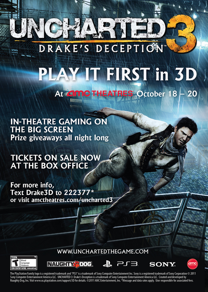Hey, are you dying to get your hands on some Nathan Drake action? Well Sony and AMC theaters are gearing up to do a pretty awesome promotion at selected theaters around the country. On October 18th-20th you can get a chance to play Uncharted 3: Drakes Deception on a giant-ass movie screen in 3d! They will also be holding multiplayer tornaments, giving away prizes, and Naughty Dog staff members will be there for you to harass. The tickets are $25 to attend but if you splurge on the special $60 pass you will get a copy of U3 sent to you in the mail. This gaming event will be held at the following AMC theaters:
