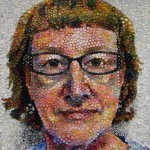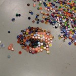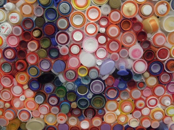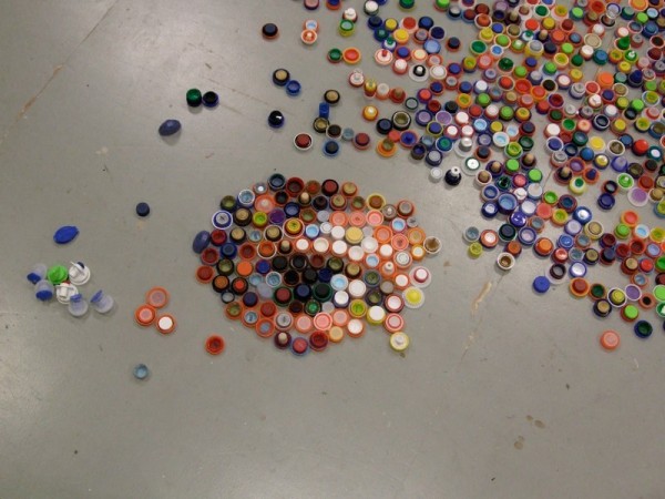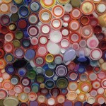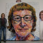 Artist Mary Ellen Cronteau was working on an artwork involving plastic bottle caps, creating tall endless strings that are strung vertically in colorful columns. She repeatedly noticed how some of the caps would fit neatly inside of one another creating new color combinations similar to the portraits of Chuck Close. Inspired, she became sidetracked and embarked on her own self portrait using the colors that “naturally” appeared in the bottle cap plastic.