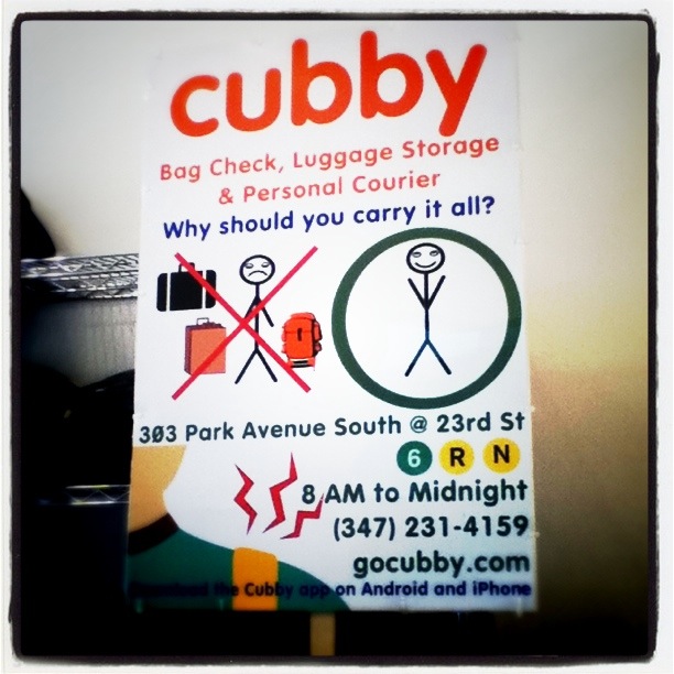 Shopping all day? Backpacking your way through the mean streets of New York City? I bet you’ll have tons of bags with you. Visit Cubby [303 Park Avenue South], drop your bags off 5USD for a small bag and 8USD for a large bag and just pickup them up later from 8am – 12am or have them delivered to you for 10USD more. Super convenient if you’re in the area. Check them out – gocubby.com