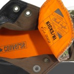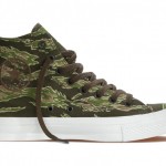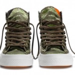 Converse collaborates with KICKS/HI (third time) for a Converse Chuck Taylor All Star shoe for Holiday 2011. The release of the Converse x KICKS/HI project will mark the 10th anniversary of KICKS/HI. The shoe’s upper is a olive, tan, brown tiget striped camouflage with a white midsole and orange accents on the inner and under the tongue .