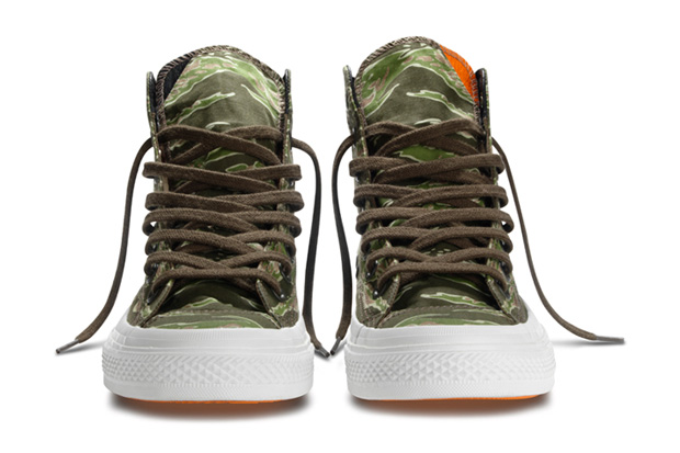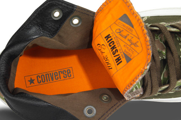 Converse collaborates with KICKS/HI (third time) for a Converse Chuck Taylor All Star shoe for Holiday 2011. The release of the Converse x KICKS/HI project will mark the 10th anniversary of KICKS/HI. The shoe’s upper is a olive, tan, brown tiget striped camouflage with a white midsole and orange accents on the inner and under the tongue .