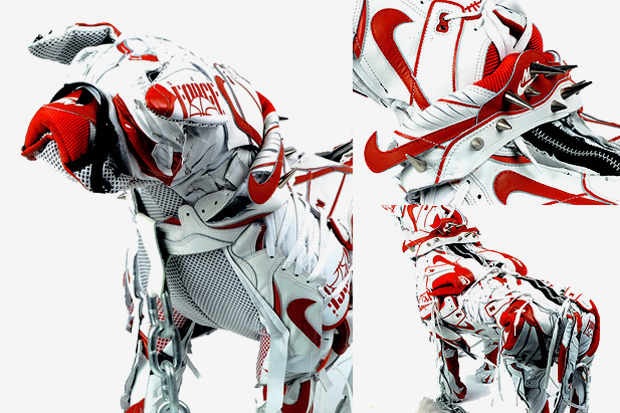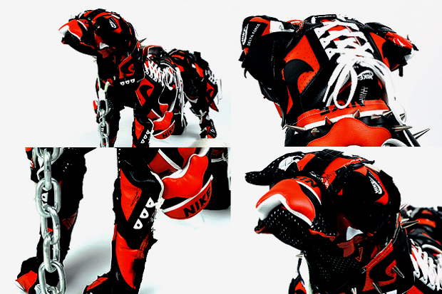 English designer Vinti Andrews, known for her reconstructive design techniques, has constructed a new series of custom dogs made out of classic Nike sneakers including Air Force 180′s, Air Max 1′s and Dunk Lo’s. The Nike Dog in several iterations is adorned with a spiked necklace and a heavy duty walking chain. The sculptures are available now via BEAMS.