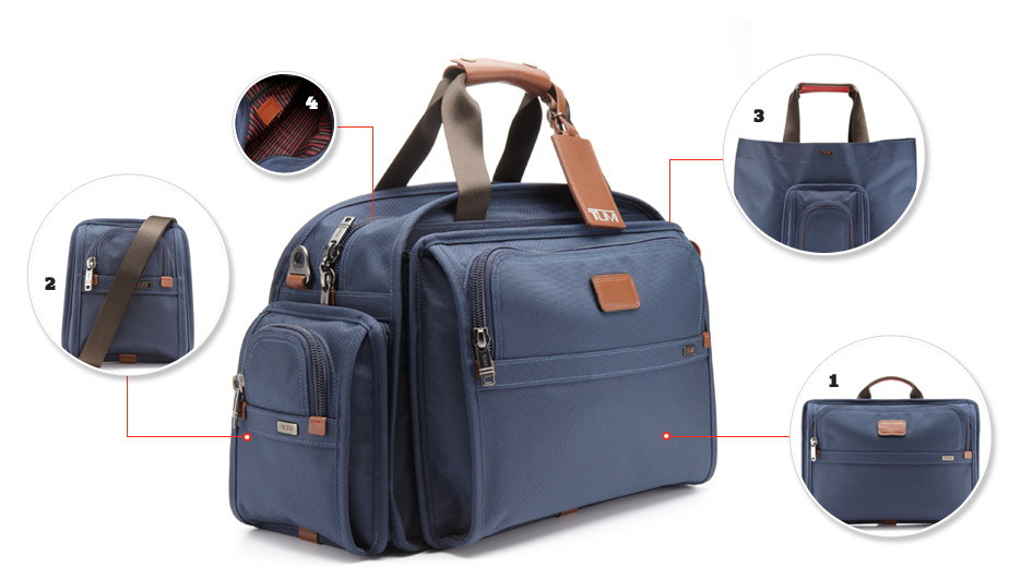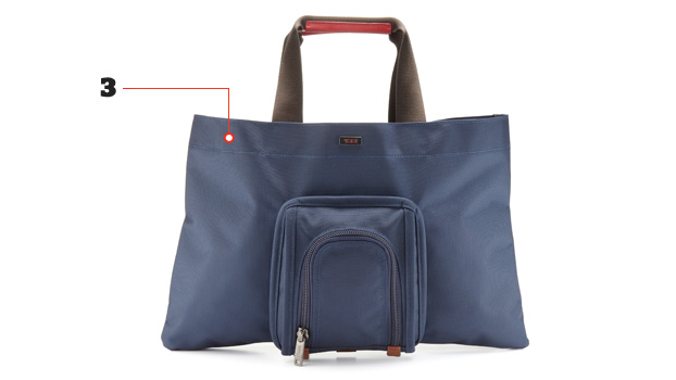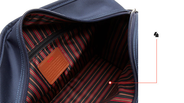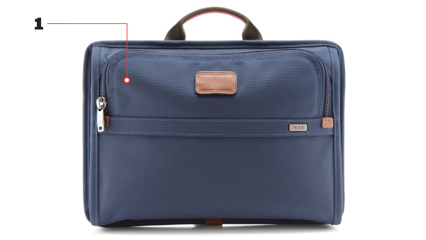 4. Custom lining: Tumi’s usual black nylon lining gets chestnut and red stripes—a nice complement to the blue exterior’s brown leather accents. Carvalho says, “We didn’t want to scream, ‘Look at my fluorescent orange bag!’ We wanted something sophisticated. We wanted the surprise and delight of something unexpected.”