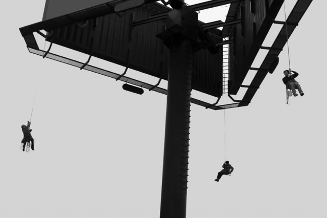 Czech pranksters converted a massive rotating billboard into a three person merry-go-round (video). The prank was filmed by Vladimir Turner, and bravely undertaken by Vojtech Fröhlich, Ondrej Mlady, and Jan Simanek (making-of video).