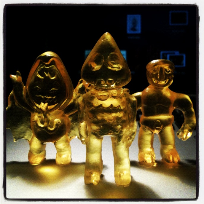 They are called the Goldies: made with an intense mixer of golden yellow clear resin & a drop of clear amber-ish gold this color-wave picks up light very nicely. I really love the intensity of the golden yellow , they feel like they were carved from fossilized amber( is that a term?). I have made a usual eight piece each of Kawako, FrightBite & Man-Nie. Each figure will be $10 each & will be on my website this thursday May 17th, 5pm EST.