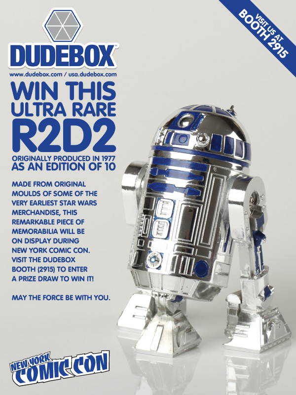 During this year’s New York Comic Con, UK based vinyl toy brand Dudebox will be going back to their roots and revisiting the world of Star Wars. On their booth (#2915) they will have on display an ultra rare R2D2 model. Back in 1977, Dudebox founder Robert Beecham was given a license to produce Star Wars toiletries, he made some of the very earliest merchandise for the film franchise. To celebrate that occassion, he created 10 metalised vinyl, hand painted figures from the original machine moulds that produced an R2D2 bubble bath bottle. These were given as private gifts to those close to the new business.