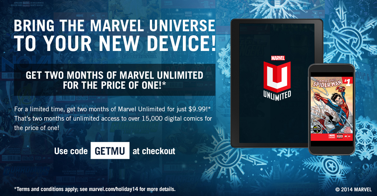 Are you looking for the best apps to download on that new phone or tablet? Look no further! This holiday season Marvel Unlimited is inviting fans to explore the Marvel Universe through Marvel Unlimited! New and returning subscribers are now able to experience their first two months of UNLIMITED access to over 15,000 digital Marvel comics for just $9.99! That’s two months for the price of one!*