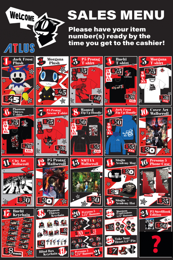 Returning to Anime Expo, ATLUS will be selling your favorite merch. From plushes that you can use to re-enact your favorite scenes while waiting for our panel, to T-shirts that just might awaken your own persona, stop by South Hall #3906 (while supplies last) for swag with your favorite characters from Persona 5 and more, including: