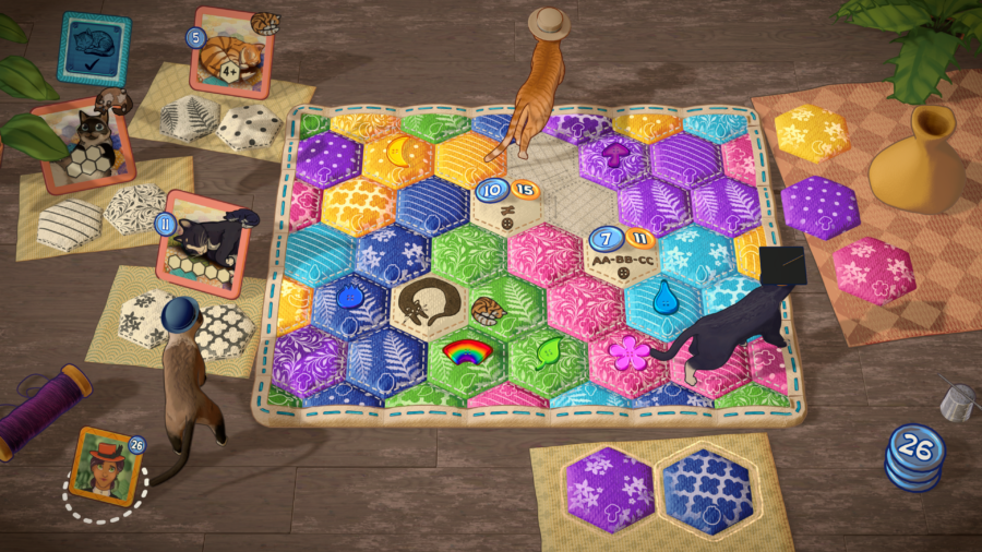 In Quilts & Cats of Calico, based on the board game Calico, you will be immersed in a warm, cozy world full of cuddly cats. Here, loud purring can be heard as the quilt softly squishes under the weight of adorable paws. It’s a world full of patterns and designs awaiting the master quilt maker.
